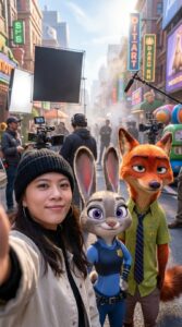 Ultra-realistic behind-the-scenes selfie photo on the set of Zootopia.