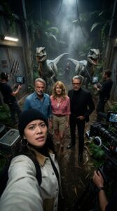 Ultra-realistic behind-the-scenes selfie photo on the set of Jurassic Park (Velociraptor scene).