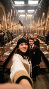 Ultra-realistic behind-the-scenes selfie photo on the set of Harry Potter.