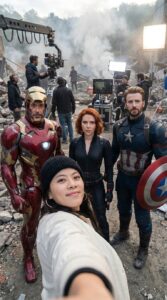 Ultra-realistic behind-the-scenes selfie photo on the set of Avengers: Endgame.